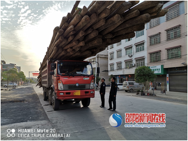 行动中,执法小组在G356北山路段,设置检查点,加强巡逻管控密度,严厉打击货车超载、非法拼装等重点交通违法行为,做到发现一起、查处一起。下午6时5分许,执勤民警在G356北山交警中队门口路段进行检查时,发现一辆牌照为湘EC68**的重型自卸货车行驶缓慢,车身满载几十根树木,存在超载、超长嫌疑。于是,执勤民警立即上前进行拦停。经检查,该车满载的树木前后共超出车身12米多长,货物总长度20多米,存在严重的安全隐患。