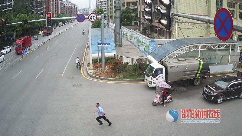 在这紧急时刻,孙志勇立即下车向小孩奔去,边跑边用手势指挥车辆避让,孙志勇一把将正冲向车辆的小男孩抱住,就在下一秒,一辆红色卡车从他右侧呼啸而过。