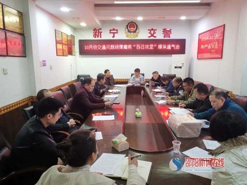 邵阳新闻在线讯(通讯员 陈贵清 赵志)10月22日,新宁县交警大队召开10月份交通问题顽瘴痼疾集中整治行动“百日攻坚”媒体通气会,红网新宁站、崀山报、新宁融媒体中心等媒体应邀参加发布会。