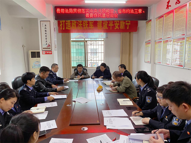 邵阳长安网讯(通讯员 张良瑜 曾洪晖 陈孝林)4月1日上午,新宁县司法局召开局机关干警大会,局党组书记蒋新华在会上传达贯彻《中央八项规定及其实施细则精神》,省委、市委“约法三章”以及县委关于加强干部作风建设规定等相关制度规定。