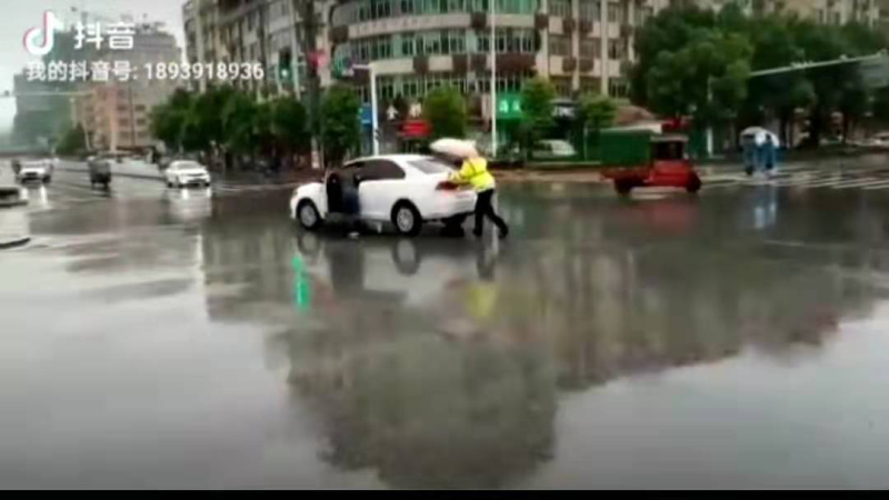 邵阳长安网讯(通讯员 陈贵清 王冰)5月19日上午,天空下起了大雨,新宁交警大队金石中队执勤交警李平在城区汽车西站十字路口指挥交通时,发现一辆小型轿车停在了红绿灯前位置,导致后方车辆无法通行。