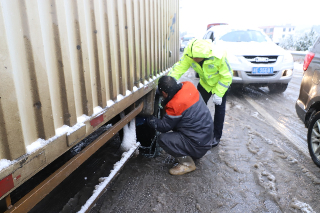 曾继武一行先后来到新田铺镇赤水岭、龙溪铺镇牛山卡、坪上镇梅寨坳等路面易结冰、湿滑路段,详细了解了车辆通行、道路交通管控情况以及民警执勤执法工作情况。26日上午,大雪纷飞,曾继武在新田铺赤水岭路面巡查时,发现一辆小货车受困,车主正准备绑防滑链,但由于经验不足,绑不好。曾继武见此情况,冒着风雪,帮助货车司机把防滑链绑好才离开。