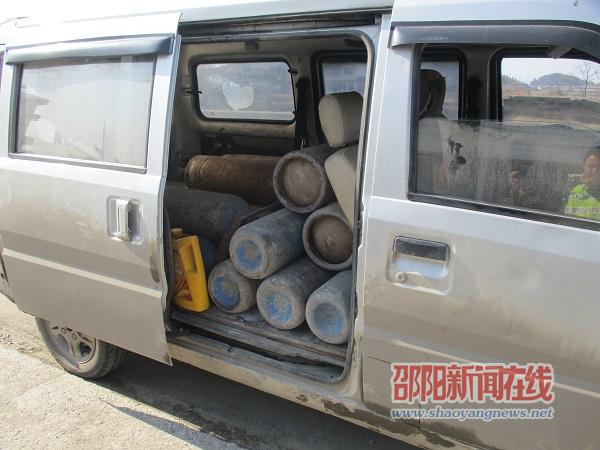 当日下午3时20分许,为确保道路安全,邵阳县交警大队长阳铺中队民警在国道320邵阳县岩口铺镇油麻井地段开展“五类重点车辆”整治行动,对客运车辆以及危化品车辆进行重点查处。民警们在示意一台车牌号为湘E2***2面包车靠边停车接受检查时,该车并没有听从指挥,而是加油门冲卡,民警们赶紧上前进行拦截。见状,民警们判断该车肯定有蹊跷,遂立即把该车进行扣押,并强行开厢检查,车厢门一开,民警们都惊呆了,只见车厢里密密麻麻排满锈迹斑斑的氧气罐,少说也有十几个。