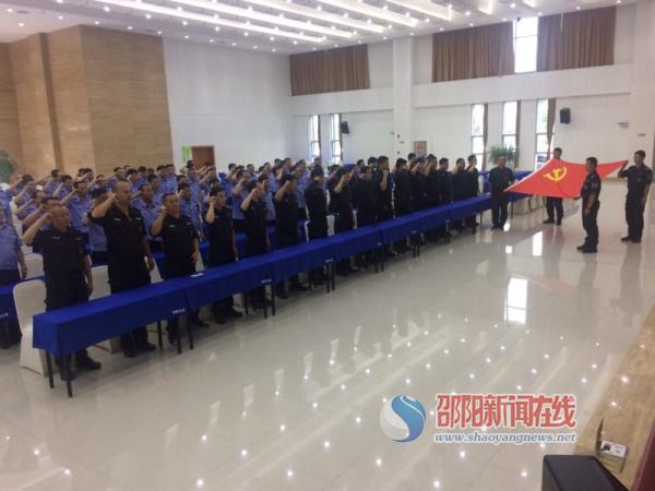 邵阳新闻在线讯(记者 袁光宇 通讯员 潘帅成)7月1日上午,在纪念建党96周年之际,邵阳市公安局从局直机关和三区分局抽调300名年富力强的党员民警,组成“邵阳市公安局防汛抢险突击队”,开展“防汛抗灾,我当先锋”主题党日活动,并在党旗下庄严宣誓:用生命和献血誓保汛期邵阳安宁!