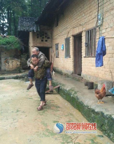 图为辅警罗鹏举背着老人转移