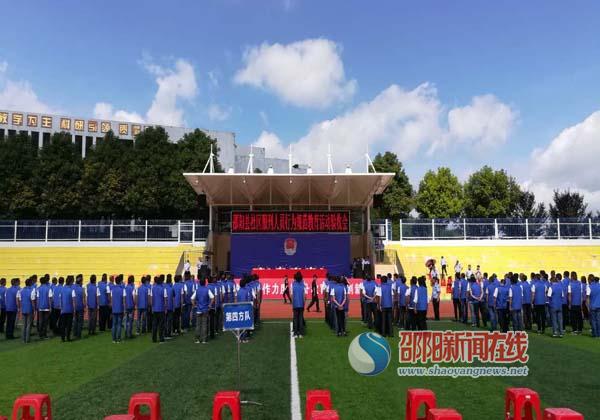 7月7日上午,邵阳县司法局在石齐学校体育馆内,举行全县社区服刑人员行为规范教育活动集中验收考核会。邵阳市司法局党委书记、局长李新华,邵阳市司法局纪委书记龙喜成,县委常委、政法委书记周彦,县人大副主任张蒲生,县人民政府副县长、公安局长刘定湘,县政协副主席罗耀国,县人民法院院长蔡明清,县人民检察院检察长刘朝洪,邵阳市社区矫正局局长刘永平,县司法局局长黎新华等领导出席,活动由县司法局局长黎新华主持,全县司法行政系统干警参加集中考核验收活动。