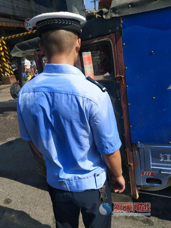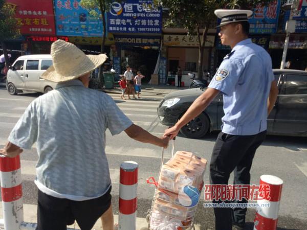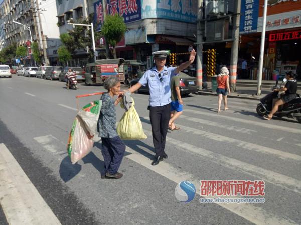 7月26日10时许,烈日当空,室外气温达到37℃,正值出行高峰期,在隆回县桃洪中路农贸市场路段,不少老人提着大包小包东西过马路,执勤民警头顶炎炎烈日,帮助他们从人行道穿越马路。