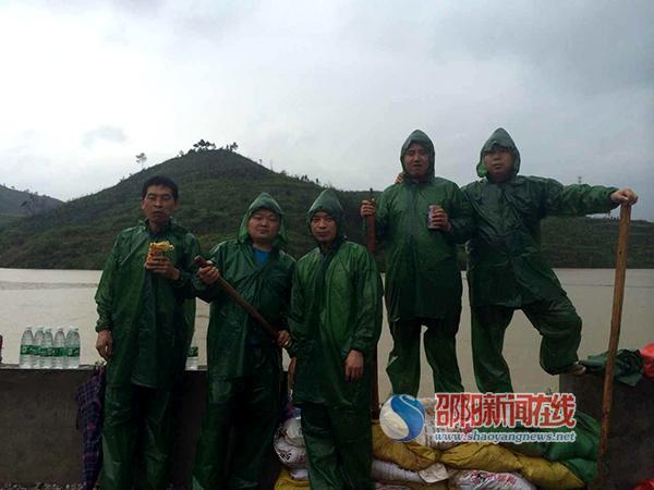 社区服刑人员(左二)积极参与抗洪抢险工作现场图