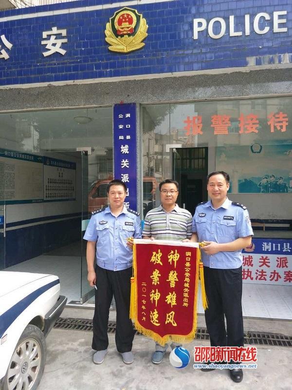 邵阳新闻在线讯(通讯员 谢定局 姚川石 易经)“你们不愧是人民的保护神,我为你们点赞!”8月4日上午,家住洞口县城的姚先生将一面“神警雄风 破案神速”的锦旗送到该县城关派出所,感谢该所民警冒着酷暑在短短5小时内迅速破案,将其落在车内被盗的数千元现金找回。“当好人民的‘保护神’,守护一方平安是我们应尽的责任。”该所所长刘平平接过锦旗,并许下庄严承诺。