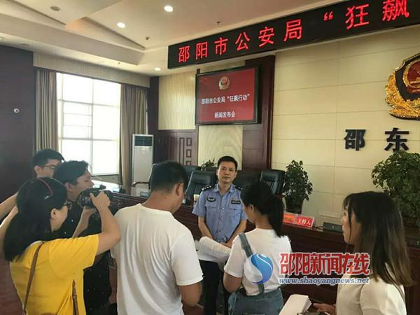 邵阳新闻在线讯(通讯员 刘博学)8月7日上午,邵阳市公安局“狂飙行动”新闻发布会在邵东县公安局多媒体会议室召开,发布会由邵阳市公安局政治部公共关系科科长潘帅成主持。邵东县人民政府副县长、公安局党委书记、局长谢伟宏,县局党委委员、常务副局长杨智成,副局长刘焕,红土岭中心派出所所长唐建国等领导及部分民警代表参加了新闻发布会。