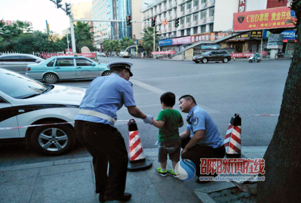 双清交警大队二中民警黄琛带领小组民警、辅警,在车水马龙中指挥疏导交通。这时,细心的民警黄琛发现,一名穿着绿色衣服的小朋友在肯德基附近转悠,显得非常着急,身旁不见大人陪同。