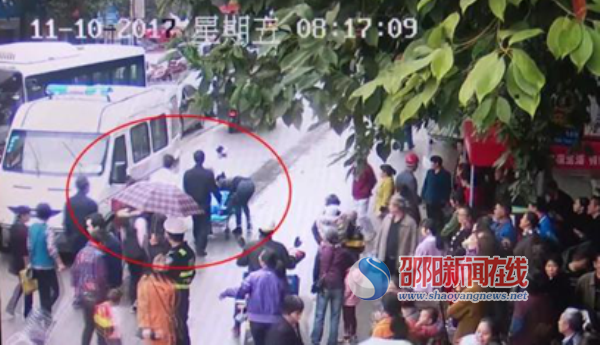 事情回到11月10日。当天上午,天空正下着绵绵细雨,绥宁县交警大队一中队辅警曾松林和县城管局协管刘先智、邓集德三人正在县城中心路维持交通、市场秩序。8时3分许,他们发现农贸市场路段突然围起了很多人。他们走过去一看,只见一名怀抱小孩的中年女子晕倒在马路中间,人事不醒。这时,马路上车流不息,女子随时被过往车辆辗压的可能,情况危险。