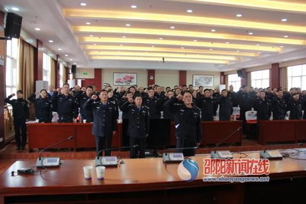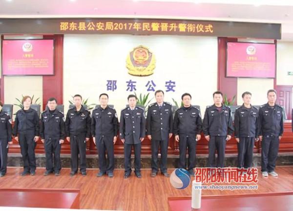 邵阳新闻在线讯(通讯员 何利明)11月15日上午,邵东县公安局举行2017年度民警晋升警衔仪式。邵东县公安局政委徐怀友,县局党委委员、副局长兼政工室主任李少林,此次参加晋升警衔培训的民警出席了仪式。