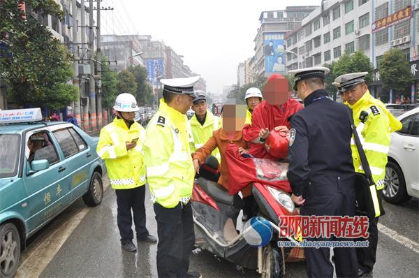 当日上午,隆回交警大队桃花坪中队组织警力20余人,在桃洪中路段开展摩托车专项整治行动。10时许,一辆红色摩托车由南往北驶来,民警示意其靠边接受检查,没想到这位驾驶员加快车速,立即上演“狂奔战”,由于天下着小雨,路滑,导致摩托车倾斜,摔倒在地,所幸的是车上无人受伤。民警赶紧上前扶起摩托车及驾驶员,经过检查,驾驶员张某,未取得摩托车驾驶证驾驶未年检、无保险车辆,还搭载其母亲。