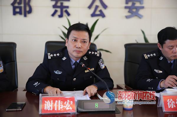 最后,谢伟宏(图三)在会上为十九大安保维稳工作做总结。他表示,党的十九大安保维稳工作开展以来,全县公安机关严格贯彻落实省厅、市局安排部署,以“四个不发生”为总目标,以“四大保卫战”为总任务,以“六大举措”为总抓手,制定了邵东县公安局党的十九大安保维稳工作“1+9”工作方案,将22类196项具体工作任务细化量化,明确大排查、大研判、大管控、大整治、大演练、大宣传六大工作措施,制定督察、问责、考核办法保障方案,强化政治保障、组织保障、作风保障、纪律保障、督察保障全力推进。全体民警、辅警众志成城、日夜鏖战,勇于担当,瞄准最高目标,取得了党的十九大安保维稳攻坚战的全面胜利,我县荣获全市公安机关党的十九大维稳安保工作第一名,被记集体三等功。赵琥珑、曾魁两名同志荣记省厅二等功,欧明炎等32名同志被市局、县人民政府战时记功,今天我们又对灵官殿派出所等6个先进单位、91名先进个人予以表彰。