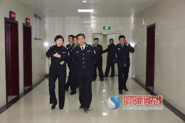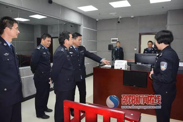 在执法办案区,陈祥松政委一行首先听取了欧明炎对邵东县公安局执法规范化建设情况的简要介绍,随后实地察看邵东县公安局执法办案区。在执法办案区,陈祥松政委一行详细了解了邵东县公安局智能办案系统的各个环节,认真听取了工作人员对执法办案区设置、管理和使用等方面的介绍,实地参观了人身安全检查室及随身物品保管室、信息采集室、讯(询)问室、辨认室、网上办案中心室等执法办案场所的规划布局,就办案区的管理和运行操作情况作了详细询问和学习。