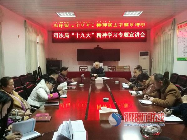 邵阳新闻在线讯(通讯员 陈平常 罗小亮 朱峰)1月15日上午,邵阳县司法局组织开展以学习宣讲“十九大”精神为主要内容的主题党日活动,全体局机关党员干部参加了宣讲活动。此次活动是该局2018年第一次主题党日活动,局党组书记局长黎新华讲课,并表示将长期坚持“一把手”讲党课制度,带头学习,努力打造学习型机关。
