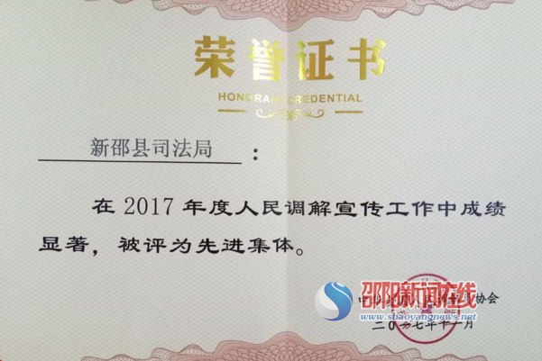 邵阳新闻在线讯(通讯员 肖爱贵)近日,新邵县司法局被中华全国人民调解员协会授予“2017年度人民调解宣传工作先进集体”荣誉称号。
