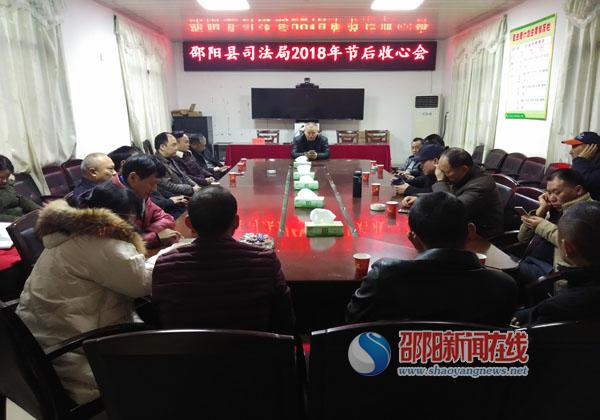 邵阳新闻在线讯(通讯员罗小亮黎英朱峰)为促使全体干部职工自觉走出节日气氛,迅速将思想和精力转移到工作中来。2月22日上午,邵阳县司法局召开了2018年春节后“收心会”。会上,学习了人民日报刊发《新的一年,致奋斗路上的你》,号召全体同志们站在新时代、新起点,围绕新目标而努力奋斗。