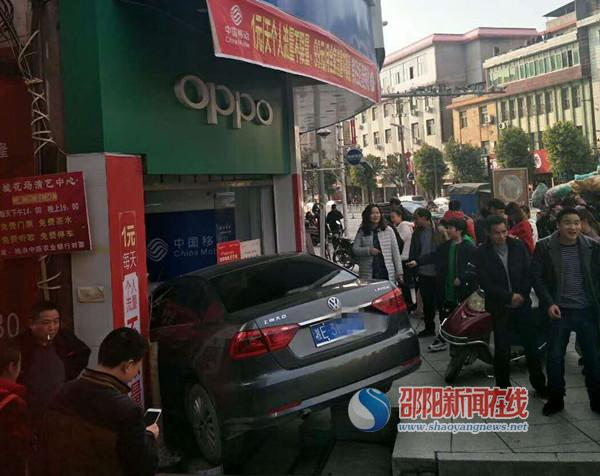 邵阳新闻在线讯(通讯员罗敏)2月25日下午15点50分许,桃洪中路烟草公司十字路口路段,一名女司机因会车时紧张,导致操作失误,误将油门当成刹车,把驾驶的黑色大众轿车冲入路旁一家手机店内。