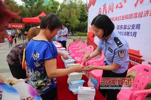邵阳新闻在线讯(通讯员 张荣)5月15日是第九个“全国公安机关打击和防范经济犯罪宣传日”。为揭露常见犯罪手法,提示风险危害,大力提升社会公众识别防范经济犯罪的能力水平,营造打击和防范经济犯罪的良好社会氛围,邵东县公安局经侦大队联合邵东县工商局于5月15日上午在百富广场开展打击和防范经济犯罪宣传日活动。局领导李许船参加活动。