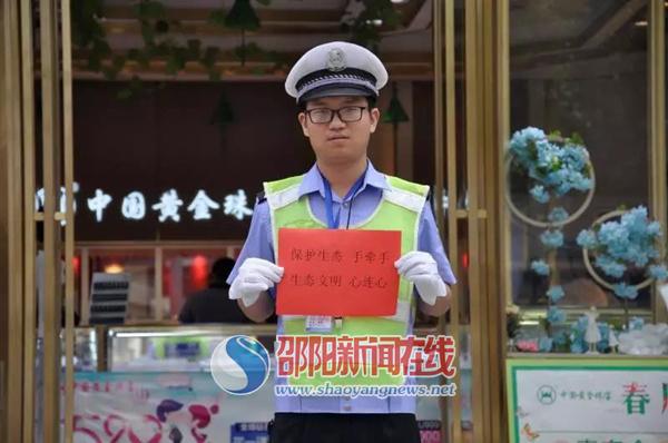 活动中,邵东交警大队民警在交警大队门口、人民医院等人员密集场所手拿“人人关心环境质量,人人参与环境保护”“山水相连你我他,生态文明靠大家”“美丽中国,美丽邵东”等环保宣传标语。向群众宣传环境保护知识,同时鼓励广大群众从自身做起,保护生态环境,让大家在邵东这片热土上共享碧水蓝天。