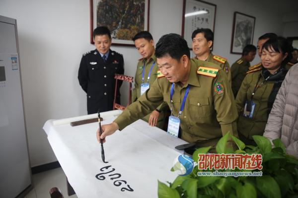 图为老挝考察团在邵东公安局警营文化中心写下老挝文“谢谢邵东公安局”