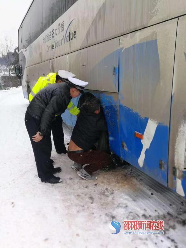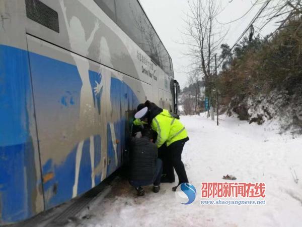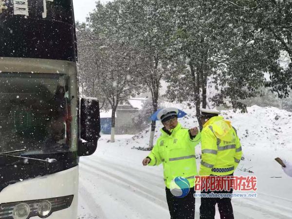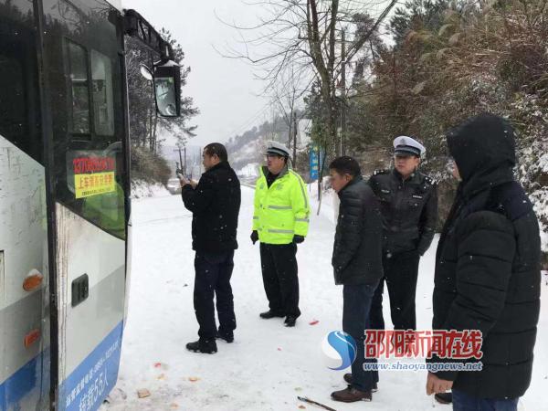 邵阳新闻在线讯(通讯员 尹志恒)2018年12月30日,正值元旦小长假第一天,绥宁境内普降大雪,境内道路均出现不同程度结冰现象,绥宁交警大队全体民警取消休假,全警上路对辖区道路进行巡逻管控。当天大队长吴浩、副大队长向先国带领综合中队民警负责沿省道S221线进行巡逻,当上午11时巡逻至李西镇陡街路段时,突然发现前方路边停了一台大巴车,大队长吴浩正诧异“当前正是客运车辆“禁运”时期,难道还有客运车辆违规营运?”便将车辆行至大巴车旁,立即下车进行察看。经询问车上人员获知他们是2018年12月29日从杭州过来的,准备驶往贵州锦屏,当进入湖南境内后才突降大雪,高速封路,从洞口下高速驶到这里,公司经理为确保安全让他们立即就地停运。