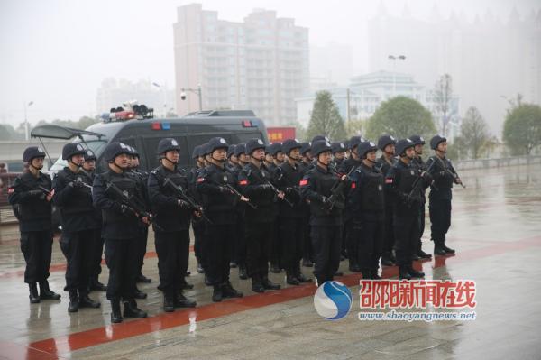 1月16日,全副武装的猎豹突击队员集结于邵东县公安局前坪。他们飒爽英姿展雄威,俨然成为当天县局一道亮丽的风“警”。