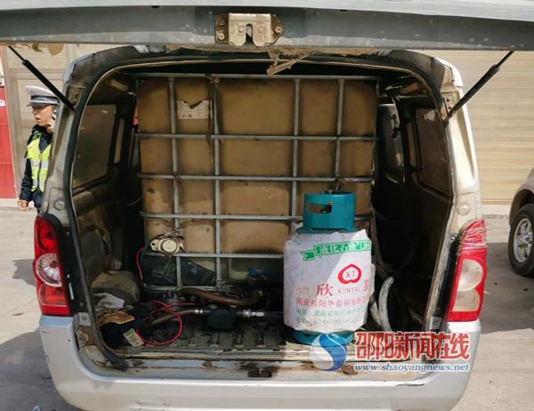 邵阳新闻在线讯(通讯员 罗敏)一辆外观上看似普通的面包车,竟然是一个“流动加油站”。4月15日9时许,隆回交警大队桃花坪中队民警在日常违法整治过程中,查获一辆非法改装的“黑加油车”,及时消除了一起安全隐患。