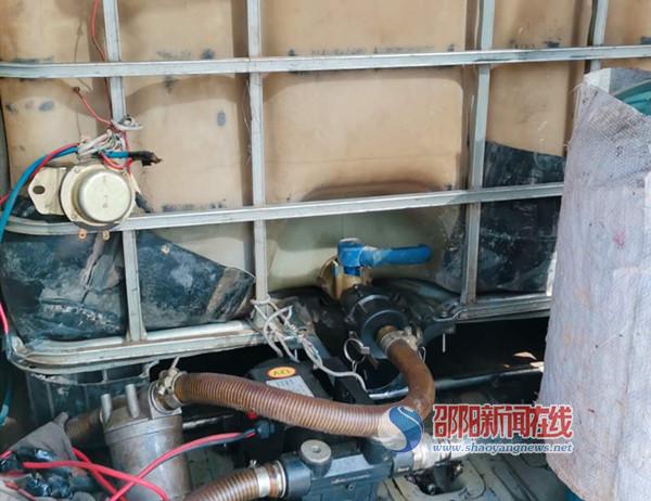 随后,民警将面包车的后备箱打开,发现车辆后两排座位全部被拆除,车内散发着浓重的柴油味,加油枪、加油电子计量装置、铁制油箱等设备一应俱全,且车内还有一罐液化气,存在巨大的安全隐患。