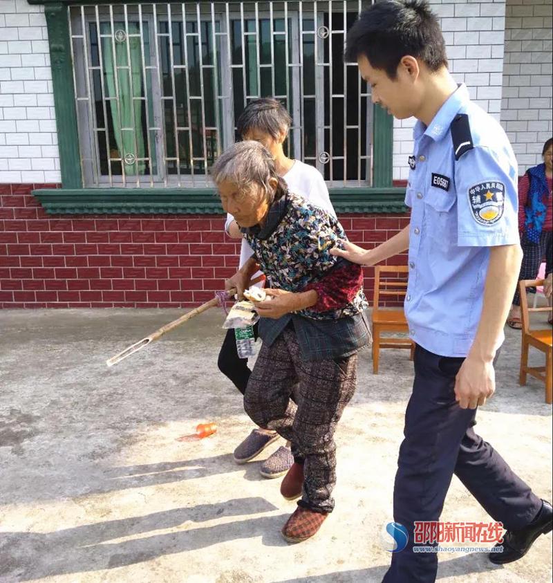 他们赶到现场后经和该老人初步交流发现他表情痴呆,口中念念有词但听不清楚话语,通过看其神情发现该老人应该是饿了。他们便弄来了茶水和面包给老人吃,待吃完东西后她精神显得好一些了,申梼宁试图和其进一步交流从其模糊的话语中得知老人提到了一个名字,便马上打电话让所里户籍人员在有关系统上进行查询最终得知该老人是邵东杨桥人,于是联系上当地派出所和村干部进行确认后通知其家属过来将其接回。