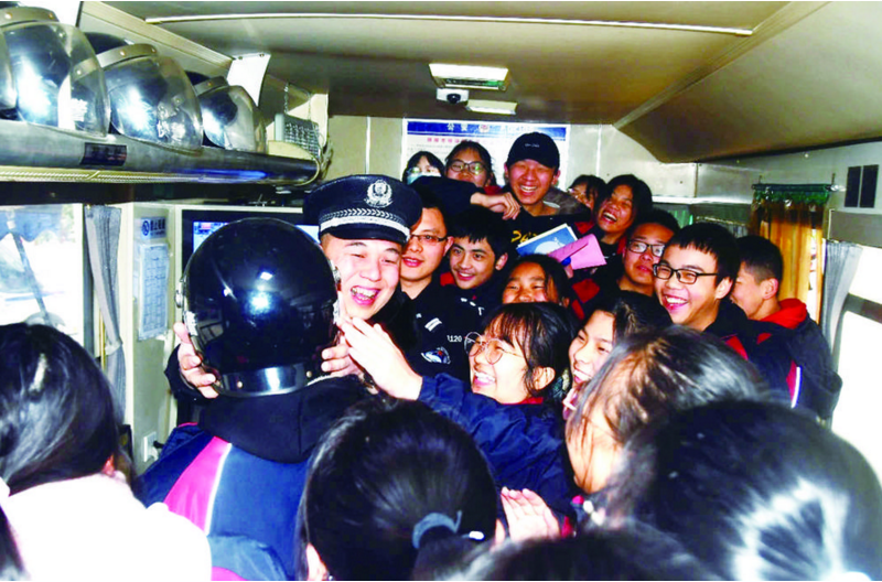 邵阳长安网讯(记者 杨敏华 通讯员 何雯)1月10日,新邵县公安局举行第一个“中国人民警察节”暨“警营开放日”活动。该局通过观摩升旗仪式、重温入警誓词等形式,庆祝首个属于自己的节日。图为学生们在参观邵阳快警新邵1号平台。