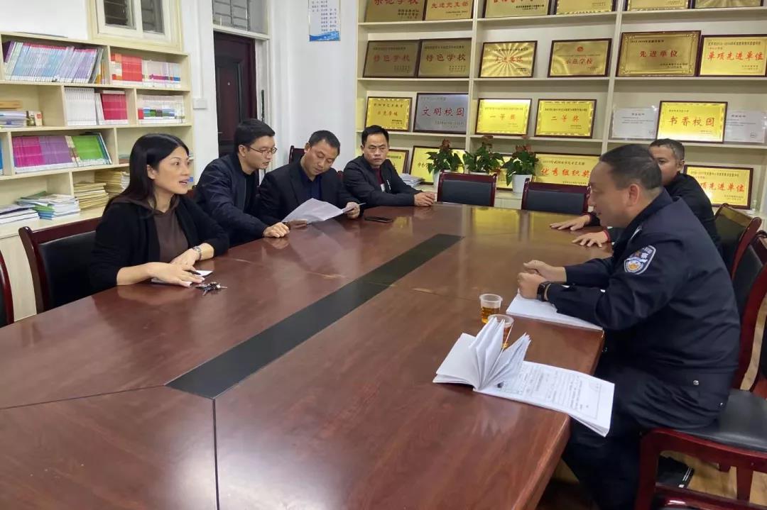 武冈公安局治安大队民警在学校听取学校安全工作情况汇报,对检查中存在的问题交换意见,并下发整改通知书