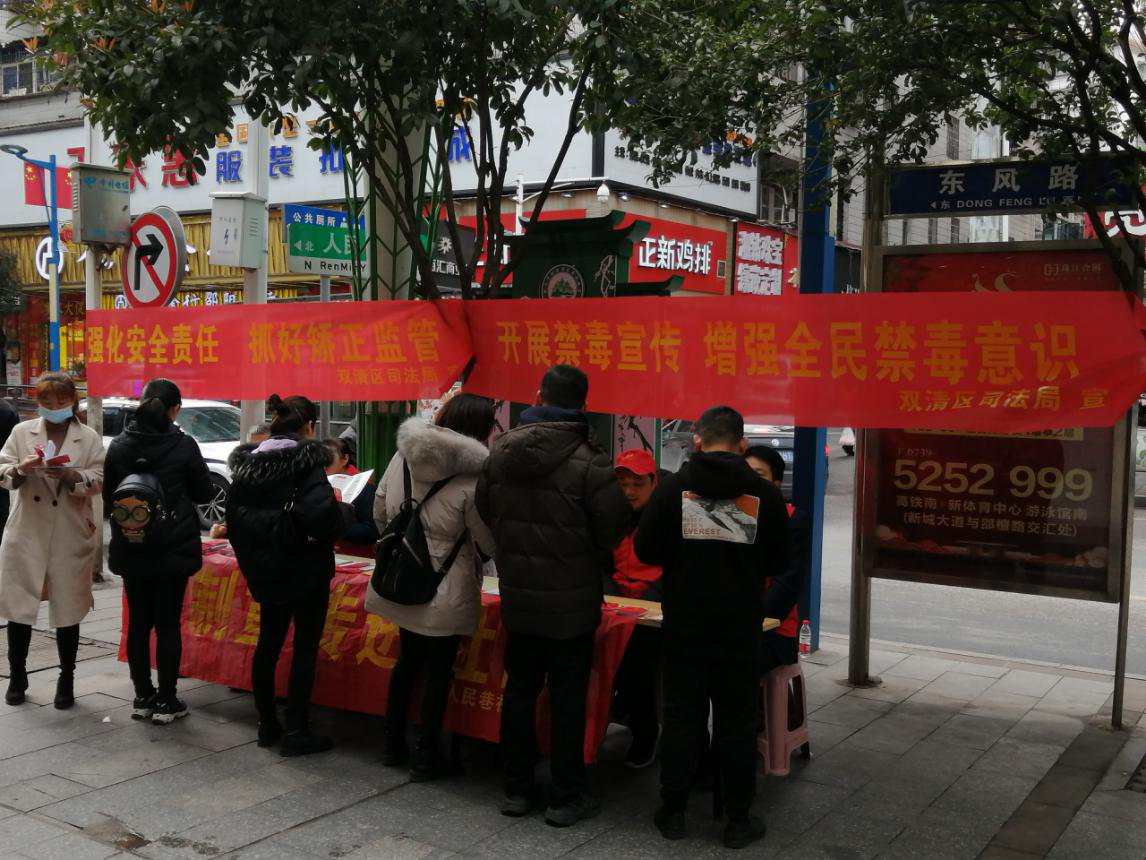 活动主要以悬挂禁毒宣传横幅、设立宣传台、向群众发放禁毒宣传资料等方式展开,双清区司法局工作人员还宣传讲解了《禁毒法》以及如何预防毒品侵害。本次活动共解答群众相关法律咨询20余人次,发放禁毒资料100余册。
