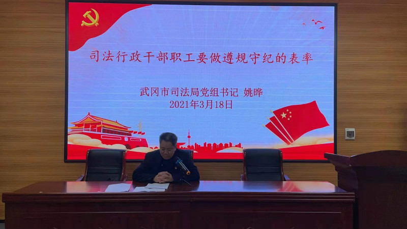 观摩结束后,全体人员在武冈市新时代文明实践中心,面向党旗重温了入党誓词,市司法局党组书记姚晔为全体司法行政干部职工上了一堂别开生面的实地教育党课。他指出,武冈市正在开展政法队伍教育整顿,这是党中央提出的新要求,是习近平总书记亲自部署,是政法战线全面从严管党治警的新举措,是人民群众继扫黑除恶专项斗争之后的又一新期待,意义重大、影响深远。全体司法行政干部职工要坚持党的领导,始终做到对党忠诚,要坚持挺纪在前,确保执法为民、公正司法,要坚持严管厚爱,加强对司法行政队伍严格管理,真正打造一支信念坚定、执法为民、敢于担当、清正廉洁,党和人民信得过、靠得住、能放心的司法行政铁军。