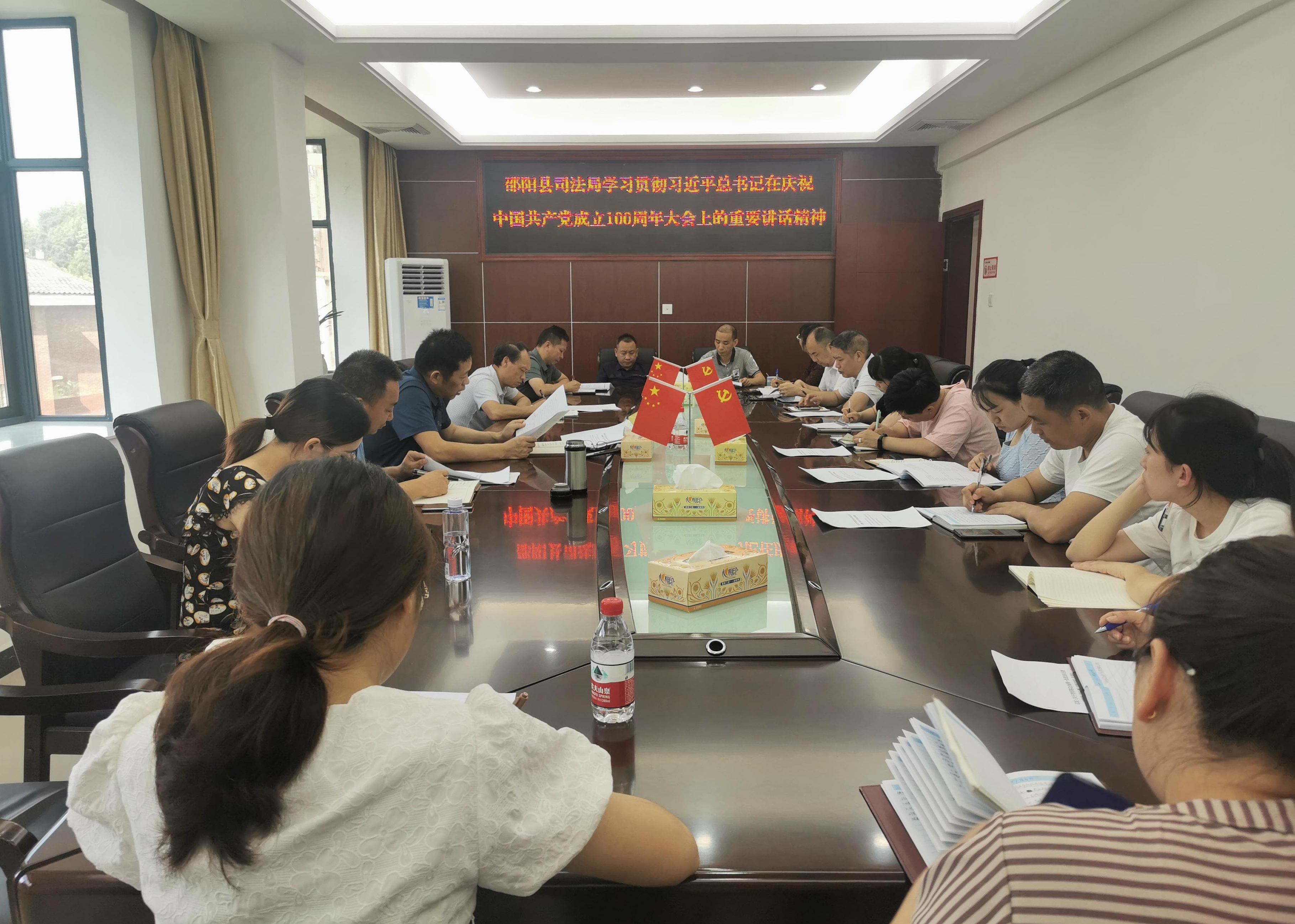 邵阳长安网讯(通讯员周志伍)7月6日,邵阳县司法局召开机关全体干部职工,学习贯彻习近平总书记在庆祝中国共产党成立100周年大会上的重要讲话精神并开展研讨交流。县司法局党组书记、局长周自珍主持会议,局机关共30余人参加会议。此次学习是县司法局党组中心组学习贯彻习近平总书记“七一”重要讲话精神理论学习的重要内容,是学习上的再深化、贯彻上的再对标、落实上的再发力。
