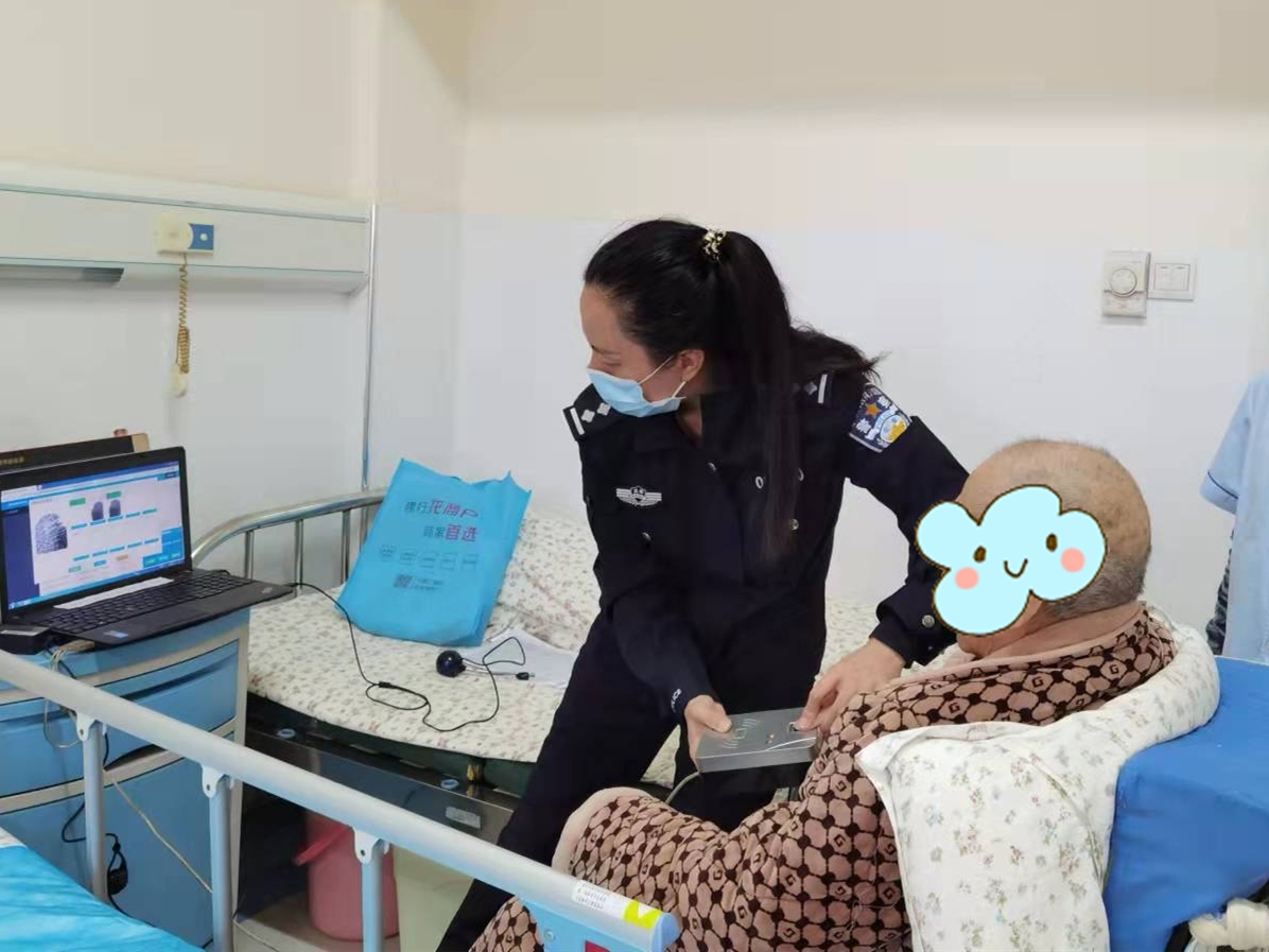 同时,近日,翠园派出所副所长李慧了解到辖区某医院有群众因患病,无法出门办理二代居民身份证,给生活带来了不少困扰。为帮助群众及时解决出门办证难的问题,11月5日,李慧带着指纹采集设备前往该医院,为行动不便的住院群众统一采集指纹,办理相关业务。当办理完指纹采集业务后,群众纷纷感激地对民警说道,“谢谢你们公安民警同志,特意跑一趟,细心负责地帮我们办理证件!”
