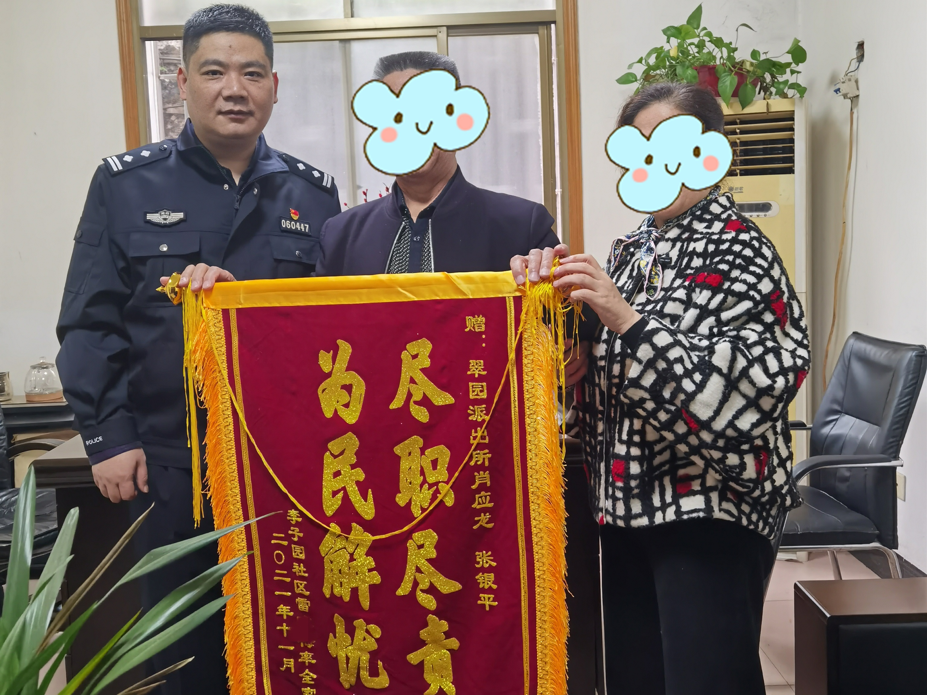 11月17日,雷某夫妇带着锦旗来到翠园派出所致谢,此时的肖应龙和张银平正在外办案,所长尹竣禾代为领取锦旗,表示一定会将他们一家人的心意转达至肖应龙和张银平。