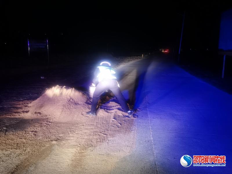 邵阳长安网讯(通讯员 李娜)5月1日,邵东市公安局交警大队在灵官殿镇应山台地段巡逻时,发现马路上有一个沙堆占了半幅路面,且该路段地处偏僻,夜间无照明,给过往车辆及行人带来安全隐患。