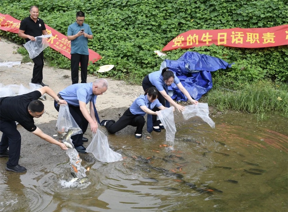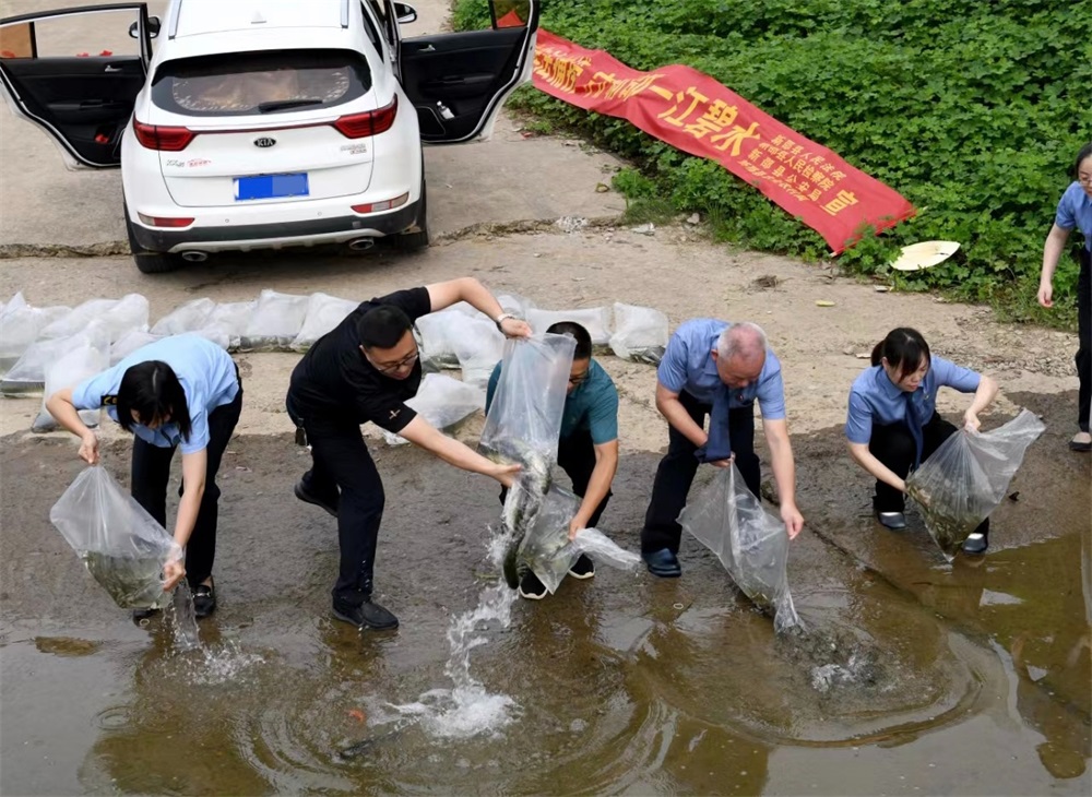当天,县人民检察院、县人民法院、县农业农村局等单位工作人员一起开展增殖放流活动,将李某等四人缴纳的生态损害赔偿费13794元用于购买鱼苗,并投放至河中,修复受损的渔业资源。